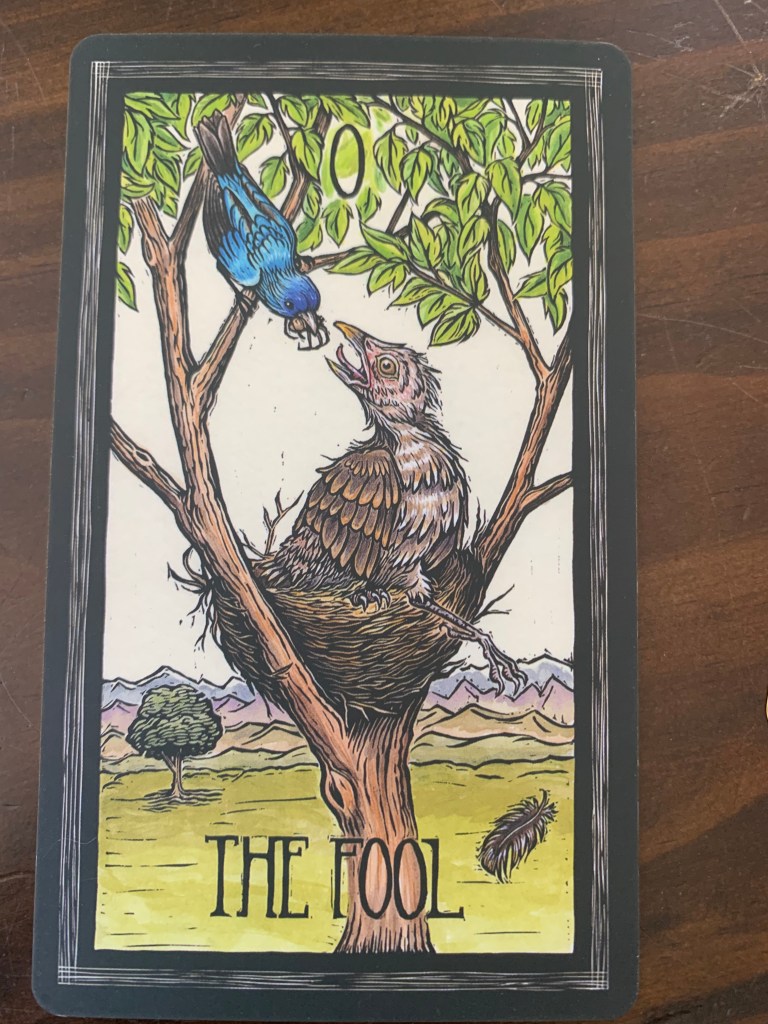 In the Brady Tarot the fool is represented by a young cowbird who has dropped a feather to test the height of the nest first before heading out on its first journey. It is being helped by a bluebird who is feeding it one last meal before it sets out alone.