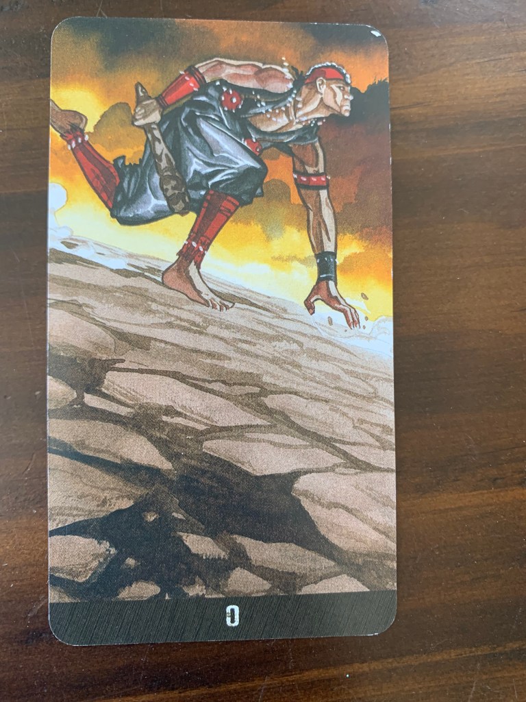 In the Afro Brazilian Tarot deck the Fool card is at the end of the Major Arcana. For me it has the connotation of openly coming from your place of power to start the next journey. Its the idea of willingly surrendering again to the journey over and over again no matter how experienced or practiced you feel you might be. There is nothing whimsical about this Fool’s journey here, this man is charging into the unknown in a way that connects to the earth in a very intentional way. Very different than stepping off a cliff into the unknown, but requiring just as much courage and surrender to head out once more and not get too comfortable.