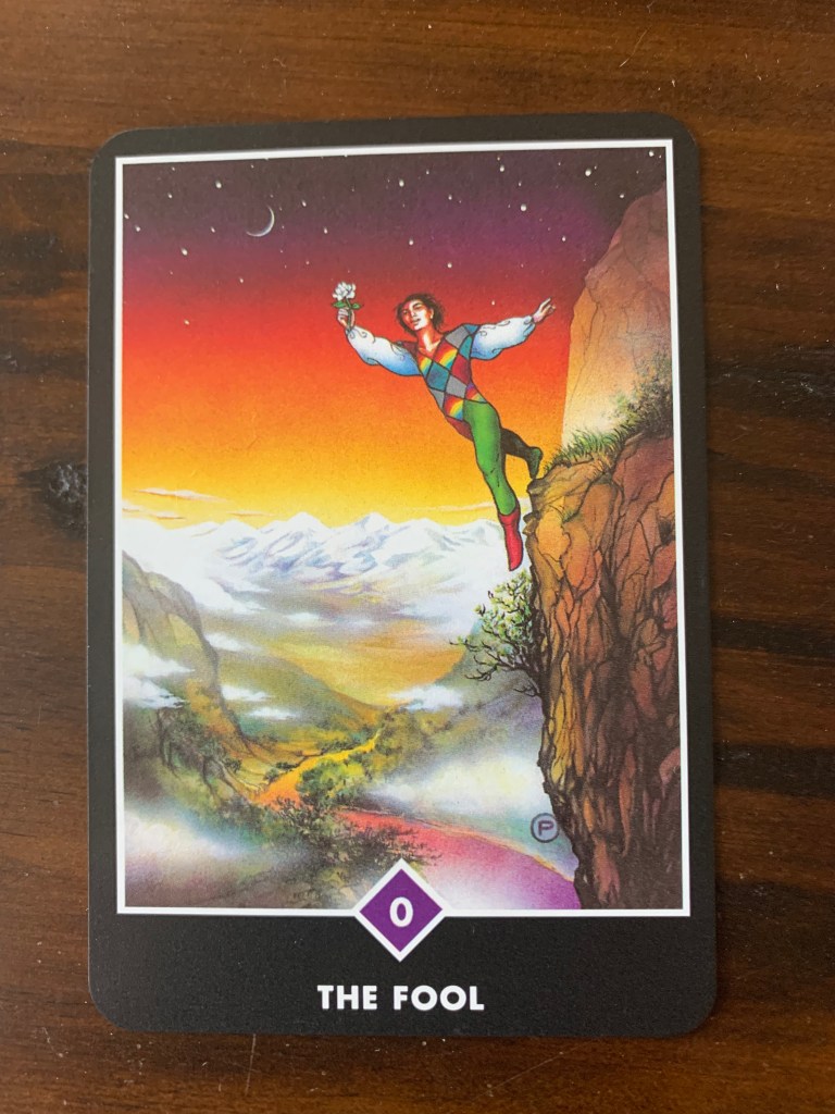 The first card of the Major Arcana is The Fool which is typically shown as a young man with a dog and a knapsack heading out on a journey, sometimes described as an epic journey. The fool traditionally carries a white rose as a symbol of peace and purity. The dog symbolizes the guide within offering divine protection, and the knapsack all of his past experiences and knowledge.