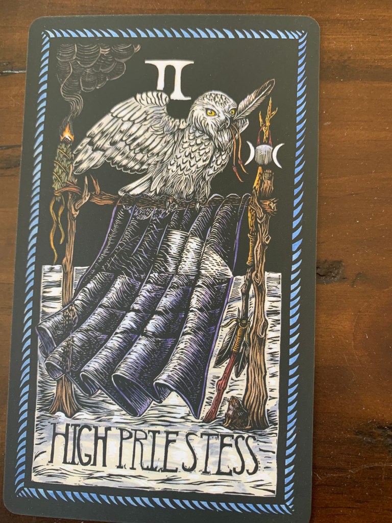 The owl holds a feather which in this deck represents the wands and spirituality/inspiration. The High Priestess is often described as the internal balance of inspiration and knowledge from within to the Magician’s Inspiration to create externally.