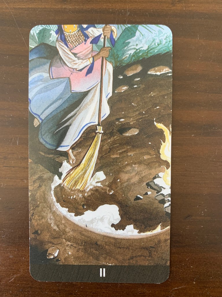 In the Afro-Brazilian Tarot the High Priestess is represented by Nana Baruku – the Orixa of rain. She keeps the atmosphere clear – another reference to the clarity required to be able to see and connect with inner wisdom. In this card she if creating the pattern of the moon within the ground surrounding the fire.