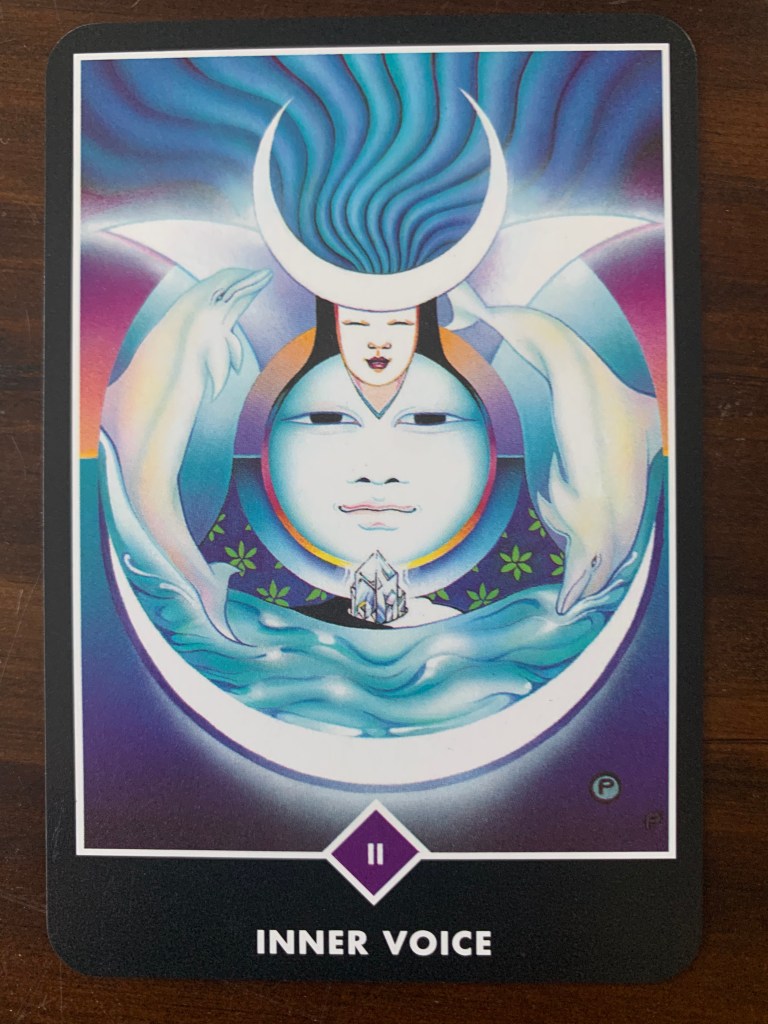 Below the round face in this card from the Osho Zen Tarot is a crystal that is transcending the dualities of light dark. It “reflects” the concept of the dark and light side of the moon from the card in the beginning of the article.