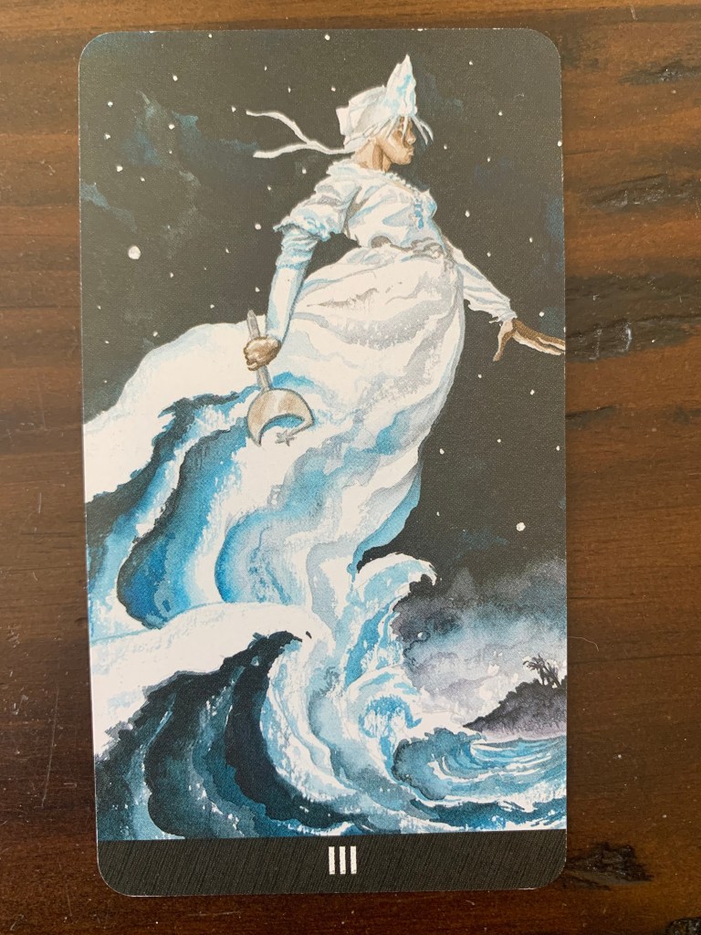 Well, I did say I wanted to see more water….in the Afro-Brazilian Tarot the Empress is represented by Yamanja, or as I’ve heard her called before, Yemoja in the Yoruba language. She is the mother of all Gods and in the Afro Brazilian pantheons, the power of the moon harnessed into controlled but nurturing emotion. The moon influences the waves and brings them back to the shore. Expanding on that we can picture that Yemoja is helping us feel grounded in our emotions as opposed to be tossed about at sea.