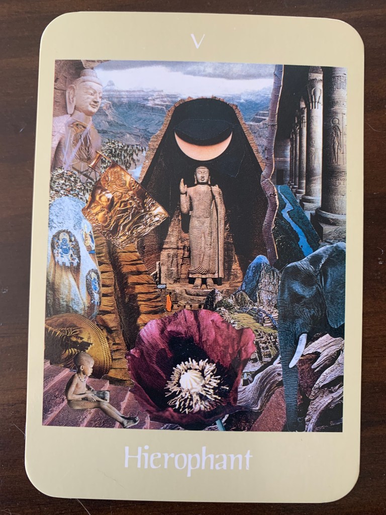 The large ears of the Buddha in the upper left remind us to listen to our inner voice of experience versus external chatter. The elephant in the lower right references the Hierophant being able to clear the way for others because of clarity and awareness. We have this awareness and clarity because we are present and have the right intention.