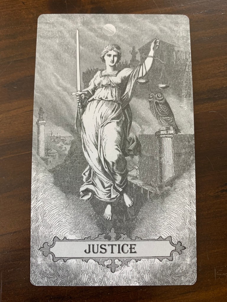 Maybe this card works if you can see Athena as yourself presiding over and taking responsibility for your own life, and understanding what actions you have and haven’t taken to get where you are in the present, but I also would caution to see the owl as all the wisdom you will ever need to stay in balance. Wisdom is dynamic, and while we can understand much at one point in our lives, in other time points we can understand very little.