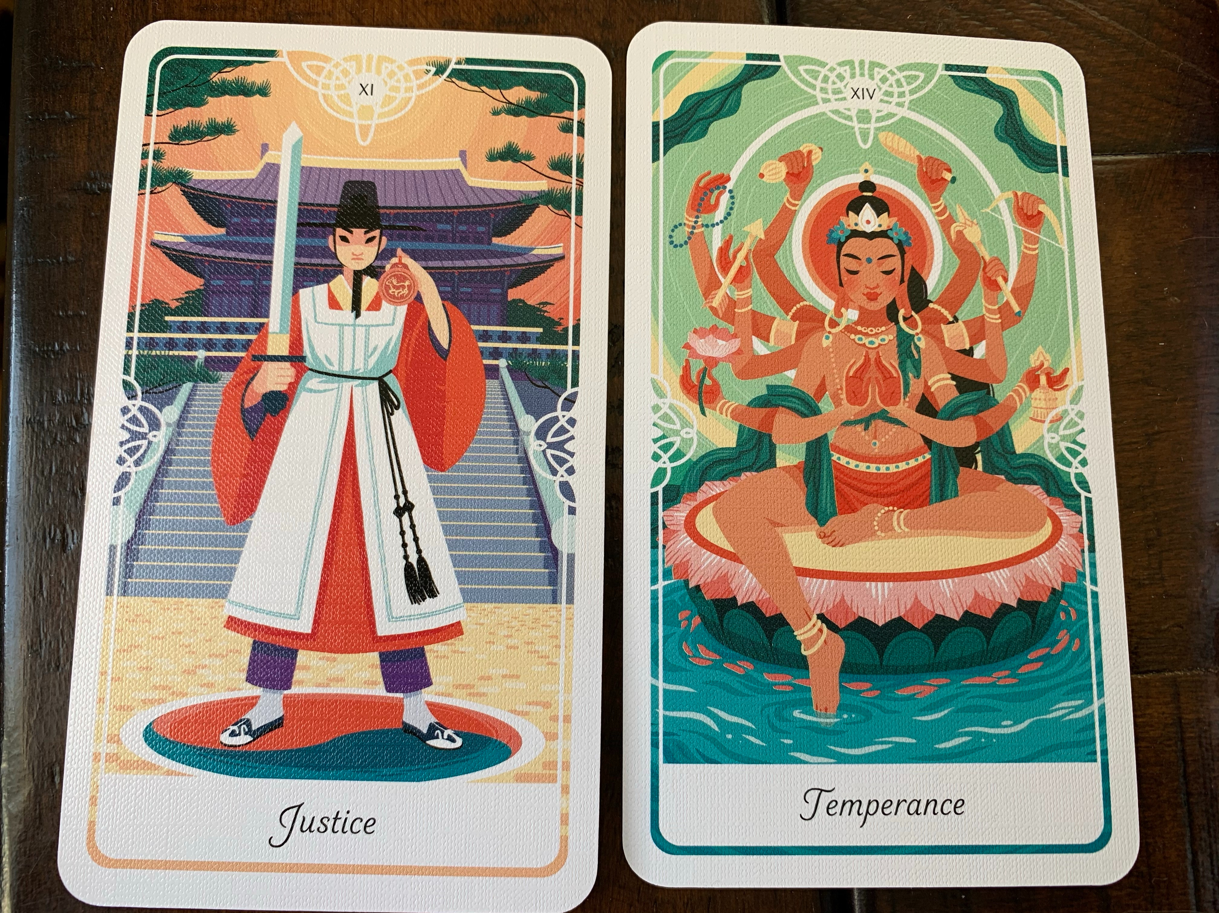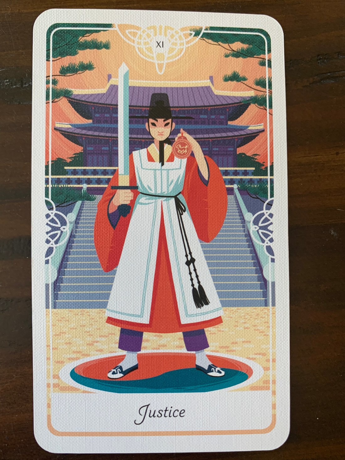 The Tarot of the Divine illustrates the concept of Justice through the Korean Legend of Amhaeng-eosa – the secret royal inspectors who were employed to spy on the local officials in each province. The Amaehg-eosa would report back to the royal government and at that point consequences would be exacted. In some cases the consequences were a reward for serving the people in a just manner, in some cases there was a punishment for corruption. In either case the inspector presented all the facts.
