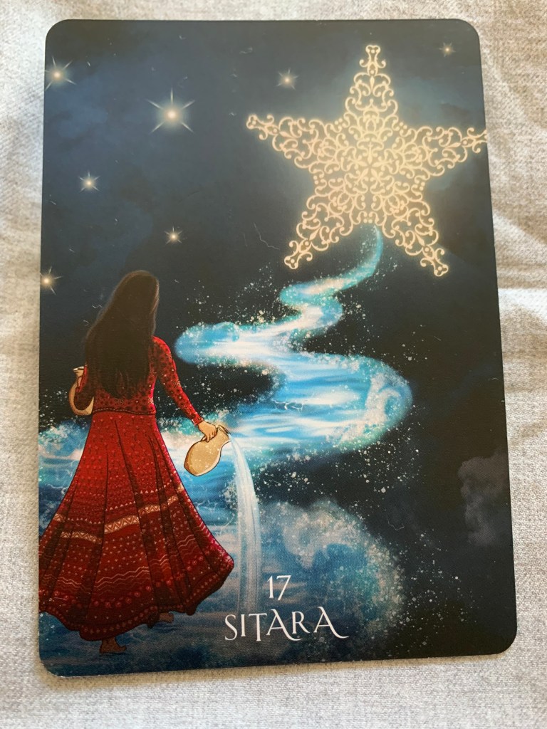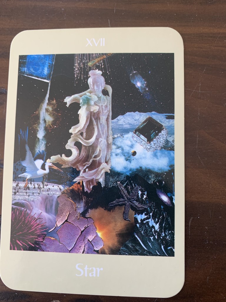 The Voyager Tarot Uses the figure of Kuan Yin as the prominent image in the Star. She is the water bearer of the universe and a Buddhist boddhisatva of compassion who pours out life giving waters and nourishes the universe. This card represents the law of luminosity in this particular deck where you recognize that you are the light that can lead others forward toward their own hope and their own path. You are the guiding light.