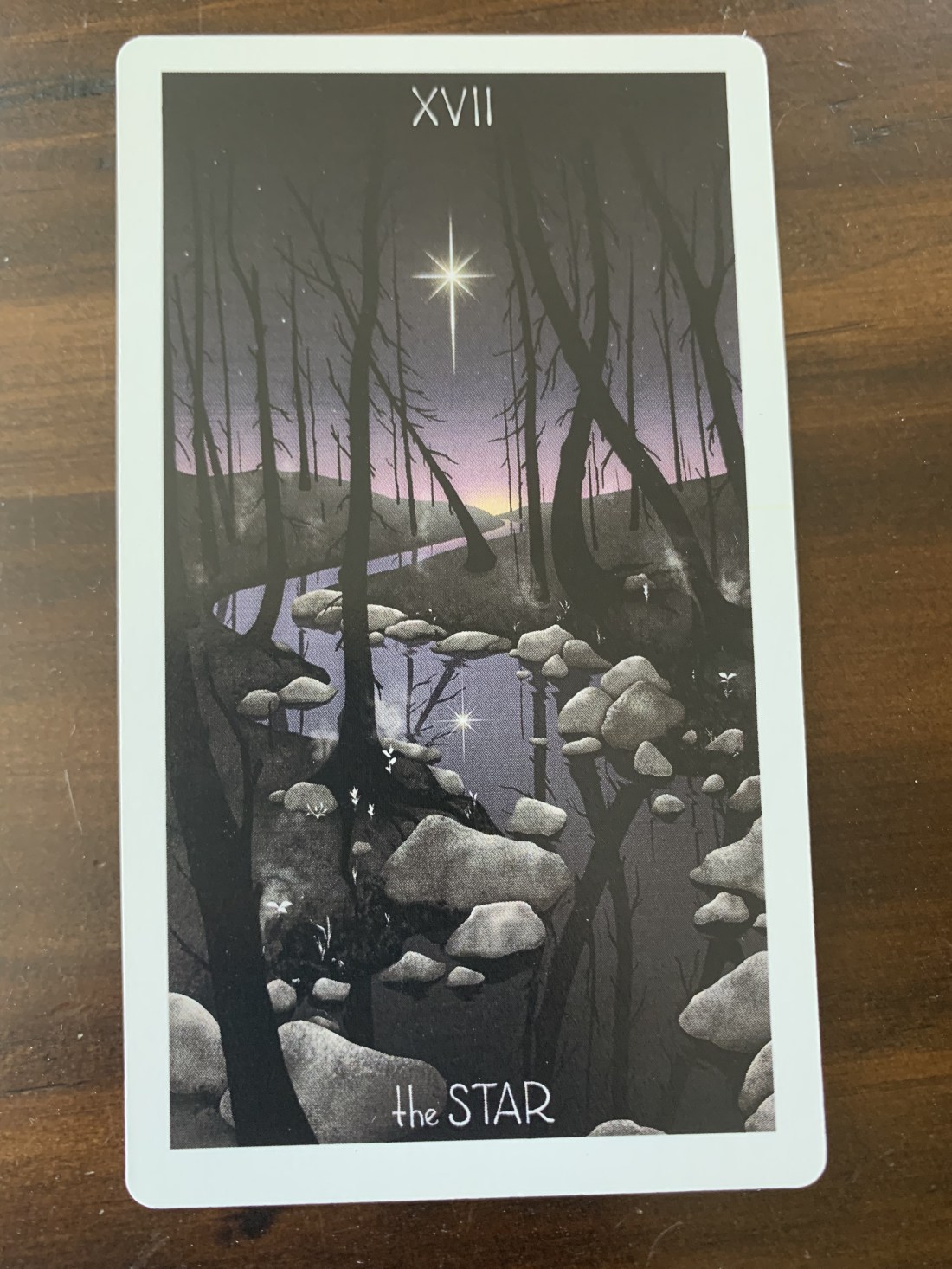 The Artist Decoded Tarot visually highlights the Star itself and its proximity to the figure. It feels like the figure is connected or being pulled by the Star in a strong way. It gives the impression of an unmistakable sense of purpose that can no longer be detached from the self. Its so materialized and clear its almost heavy.