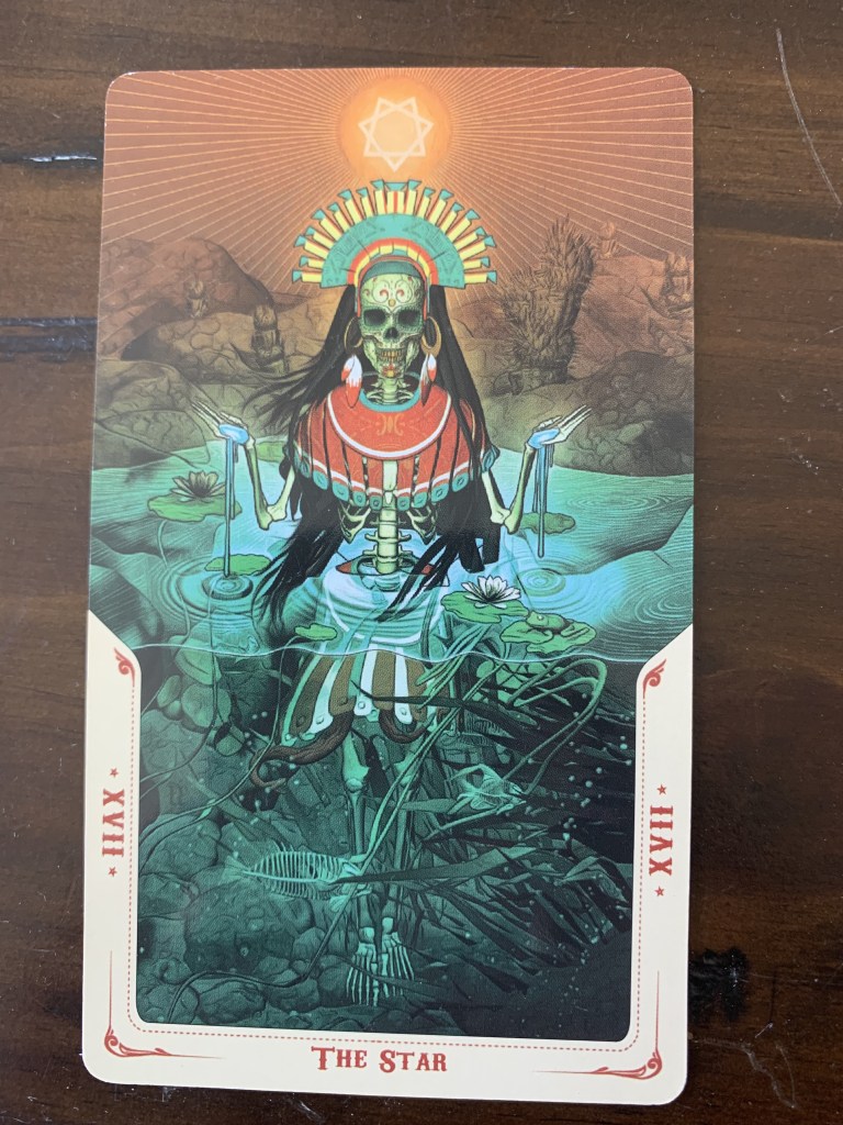 The figure in the Star of the Santa Muerta Tarot has been here before. This person has been through so many iterations of this path that they are fully submerged in it and its work. They keep being reborn into it in fact. In this version of the life they keep repeating they are finally fully immersed in their environment and full of hope. They are not treading water, they are so deep and grounded they stand on the foundation of the emotional waters themself, and they can now move the water in subtle and important ways.