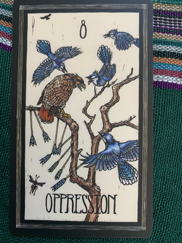 The arrows are a tough road, its the road of the mind, and it can get a little dicey. In the 8 of arrows from the Brady deck we have several scrub jays pummeling a hawk with words and sometimes even nips of the beak. Not only that but it looks like 8 arrows have come from below the hawk, so it feels like its being attached from above and below.